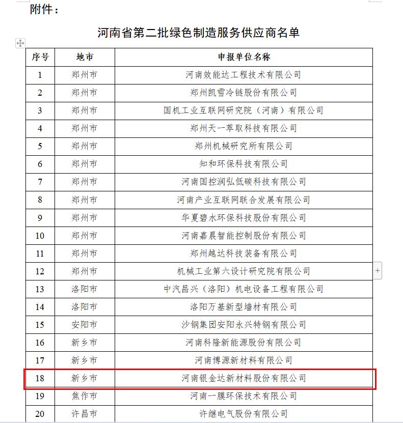 近日,河南省工信廳公示河南省第二批綠色制造服務供應商名單,河南銀金達新材料股份有限公司在列。